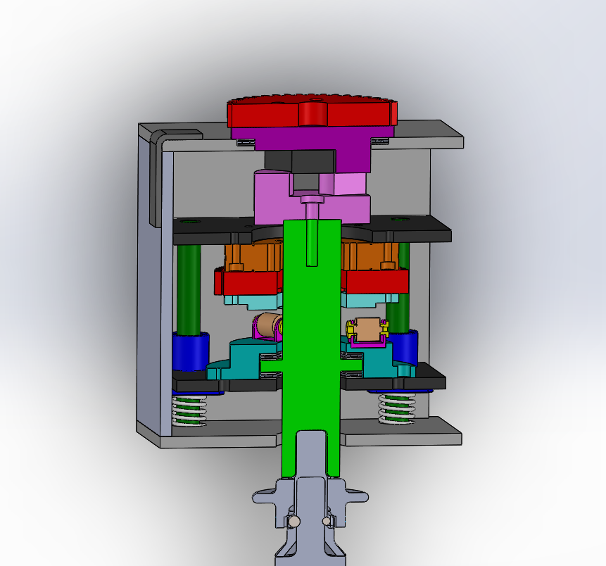 It was decided a barrel cam was our best option to produce the percussive motion, while the rotation would simply be driven by a gear at the top of the drill shaft. The independence of motion was allowed through a floating jaw coupler, with the aid of thrust needle bearings. The mechanism had to be designed with longevity and efficiency in mind given the nature of the applications. After multiple iterations of the barrel cam, a final design greatly reduced friction and wear on the part to maintain the requirements of mechanism efficiency and lifespan.