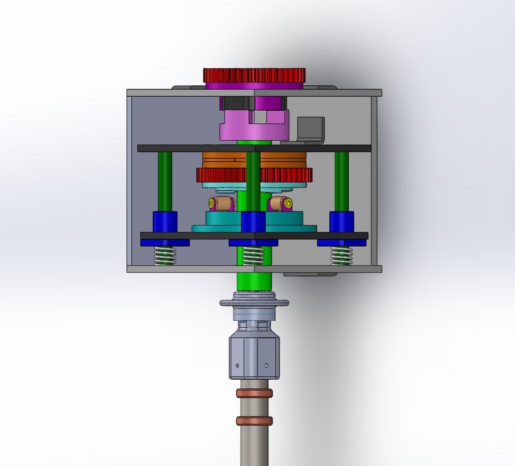 For my senior capstone design project, I was fortunate to be selected to develop a novel regolith drill along with four other classmates. Sponsored by Techno Planet Inc., The Regolith Drill capstone team designed a prototype assembly of a variable speed rotary-percussive drill and drill-bit to be capable of drilling a one meter hole into the permafrost layer on terrestrial and extraterrestrial surfaces. It is capable of heating the drilled hole using an integrated heating rod in the center of the drill bit to allow for the capture of vaporous substances released after heating. The design includes two separate motors to control the rotary and percussive motion independently, so that the ratio of beats per minute to rotations per minute can be optimized.