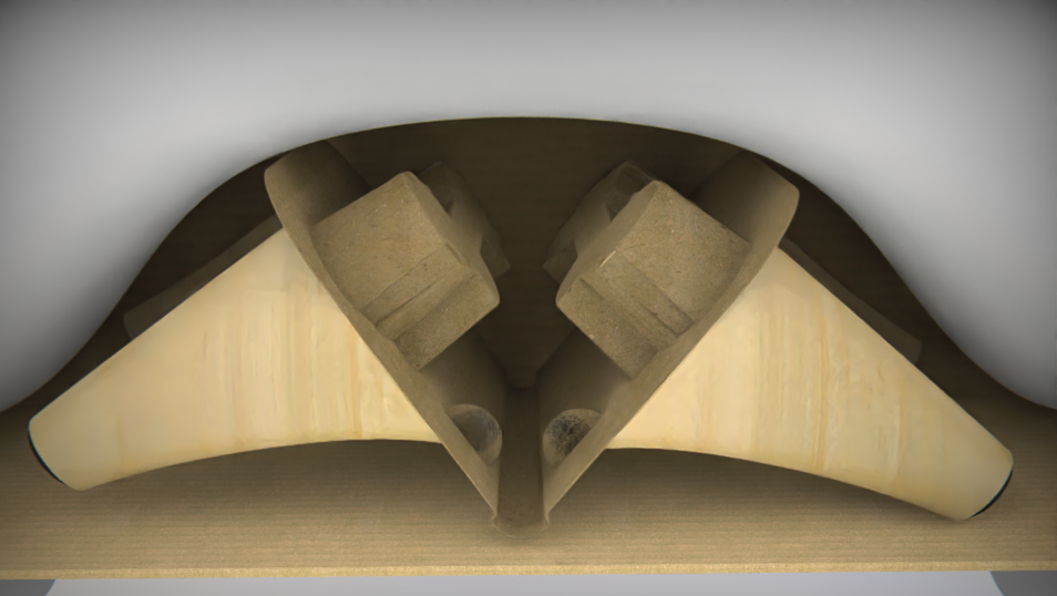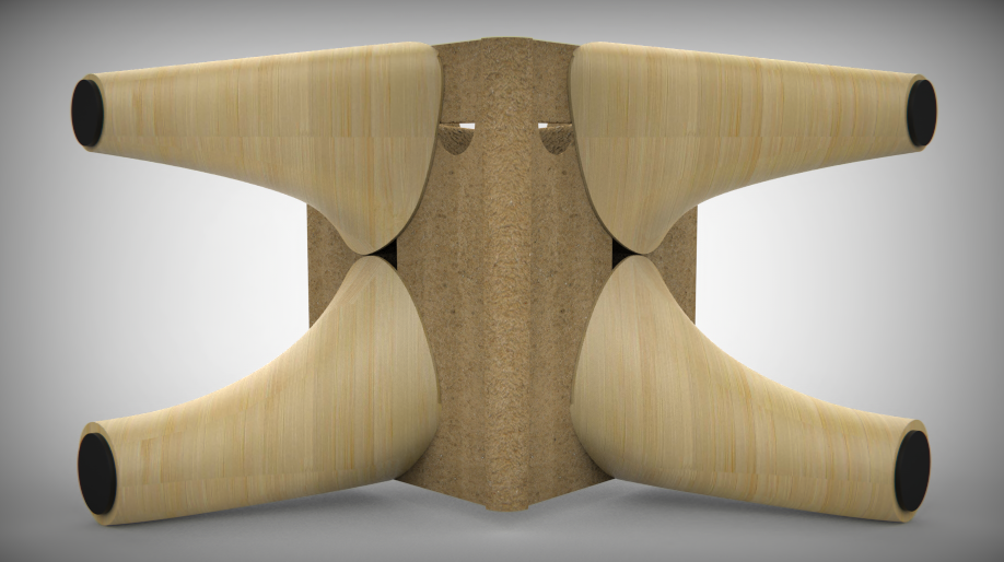 My first prototype was creased and hand-cut cardboard, with the cut-out geometry allowing only a specific leg in a specific orientation to be inserted. After performing an initial feasibility check with a series of these hand-cut prototypes, I designed and 3D modeled a molded-pulp version. This considered ease of manufacturing and the specifications of molded pulp design. I incorporated four bosses, two per wing with each having it’s own unique pattern. These boss pairs were bridged together to improve the rigidity of the structure. They also possess crush ribs to keep the legs in place once inserted. The piece is molded flat with all bosses being perpendicular; a living hinge was added to allow for this simple to manufacture design. Once molded, the piece can be bent along the hinge to the appropriate packing angle. Embossed by each cavity is the respective leg number. Lastly, crescent lifts were added to promote the unboxing experience.
